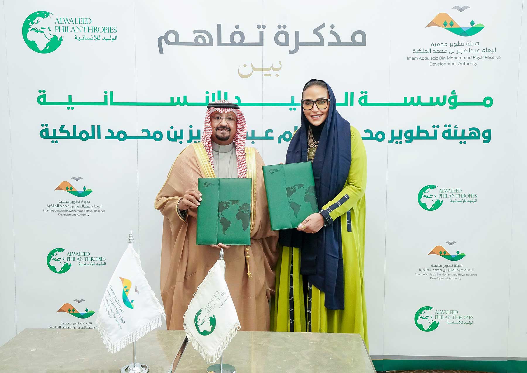ووقّع المذكرة كل من صاحبة السمو الملكي الأميرة لمياء بنت ماجد آل سعود، الأمين العام لمؤسسة الوليد للإنسانية، وسعادة الرئيس التنفيذي لهيئة تطوير محمية الإمام عبدالعزيز بن محمد الملكية، الدكتور طلال الحريقي. وتهدف إلى تعزيز التعاون بين الجانبين لإطلاق مبادرات تنموية مستدامة في محمية الإمام عبدالعزيز بن محمد الملكية ومحمية الملك خالد الملكية، تسهم في تأهيل الكوادر الوطنية، وتوفير فرص عمل مباشرة وغير مباشرة، وتعزيز مشاركة الشباب في العمل البيئي والتنموي.